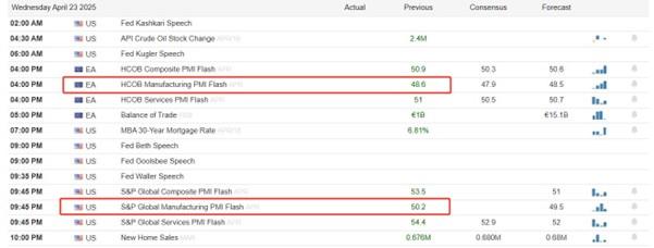 歐美主要發達國家將於本週三陸續發布製造業和服務業PMI數據,其中最受市場關注的是美國和歐元的製造業PMI數據。今日21:45,美國4月標普全球製造業PMI初值將發布,前值為50.2,預期值49.4,預期下降,且低於50榮枯線,利空美元概率較高。今日16:00,歐元區4月製造業PMI初值將發布,前值為48.6,預期值47.5,預期下降,繼續偏離50榮枯線。美國和歐元區的製造業PMI數據均預期悲觀,這與當前激進的對外政策有關。如果特朗普的政策沒有放鬆或者轉向的可能,歐美國家的製造業可能遭受嚴重衝擊,PMI數據存在進一步下降的可能。