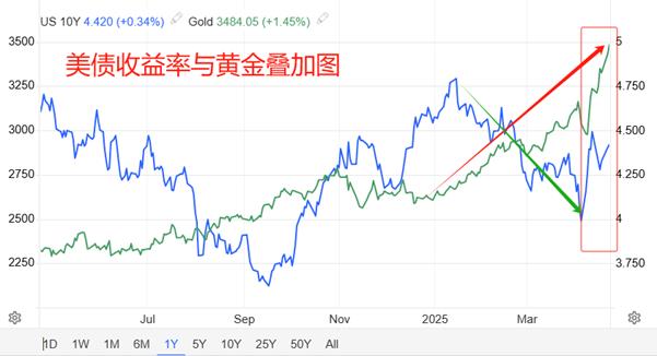 在央行的儲備資產當中,黃金和美債具有相互替代的作用。在行情面,美債收益率升高,黃金的比較優勢降低,市價存在下跌可能。相反,美債收益率下降時,美國和全球經濟的衰退可能性增加,黃金將進入牛市週期。今年1月13日,美債收益率觸頂回落,直至4月4日才尋得底部。期間,黃金一路大漲,市價從2600美元左右漲至3100美元左右,市場買入情緒濃厚。