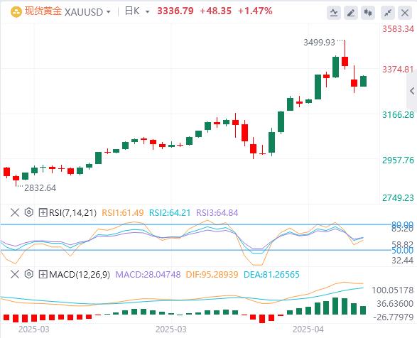 週四亞盤,黃金交投3336.79附近。此前美國總統特朗普稱不打算解僱美聯儲主席,並暗示與在關稅問題上取得進展,投資者對風險資產的胃納有所改善,美元和美股展開反彈,對金價形成壓制,金價在3500關口受阻回落後,更多短線多頭獲利了結也對金價形成拖累。本交易日將出爐美國3月耐用品訂單月率初值和美國截至4月19日當周初請失業金人數,投資者需要予以關注,另外,需要繼續關注國際貿易局勢和地緣局勢的相關消息。