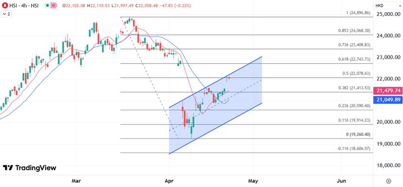XM港股:憧憬關稅戰關係緩和,港股連升兩日累漲505點後,今早再升逾500點,重上兩萬二關口。恆指半日昇519點或2.4%,報22,081點:國指升171點或2.2%,報8,121點;恆生科技指數升152點或3.1%,報5,051點,大市半日成交1,474.08億港元。