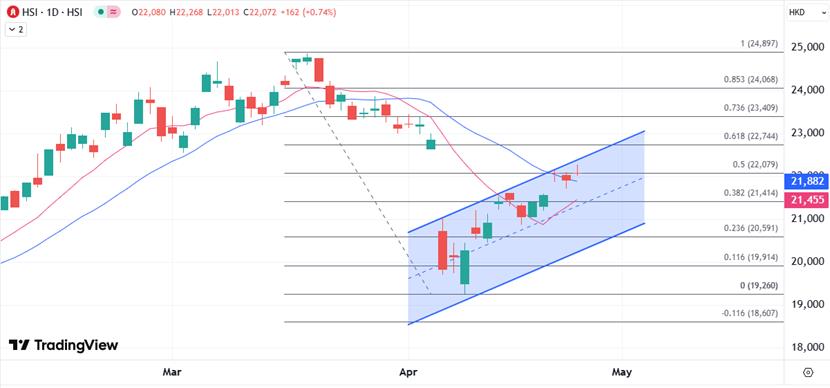 恆指本週整體呈現向上的走勢,當前處於4月初的高位範圍,週線有望鎖定至少3%的漲幅,為連續第三週週線上揚,為2月份以來的首次,技術上也接近近期上行通道頂部,所以留意會否再繼續上望23000關口也會伴隨著阻力,如果突破上述關口,意味著進入2月下旬至4月初的主要高位區間,可以吸引更多的買盤。